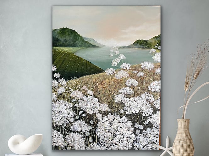 My paintings are influenced by my surroundings on the beautiful Waiheke Island, while remaining with my favoured floating theming. However, I often muse over an intriguing woman with flying red hair who has frequented my paintings since I began painting and selling my work in the early 2000s.