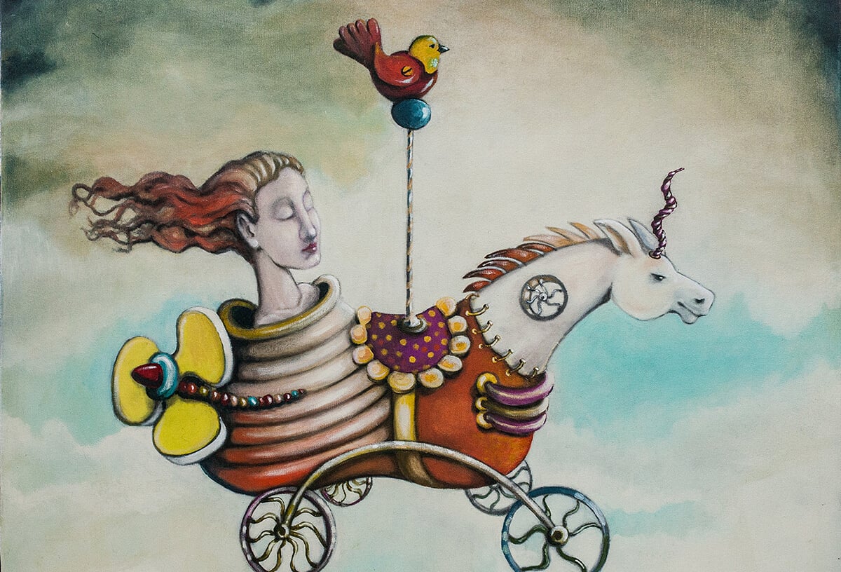 Sometimes I am just trying to paint a feeling, such as joy or freedom. Sometimes my work is whacky, influenced by steampunk and the world of Dr Suess.